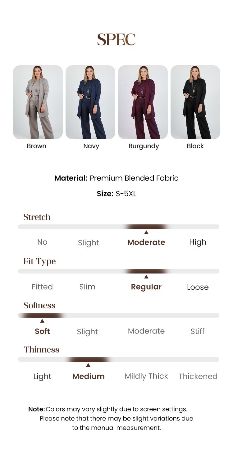 [Inclusive Fit] Designed with a relaxed silhouette, the Elegant Longline Cardigan & Top and Pants 3-Pieces Set perfectly accommodates various body shapes, promoting confidence and freedom of movement. Enjoy a comfortable fit that highlights your natural curves.